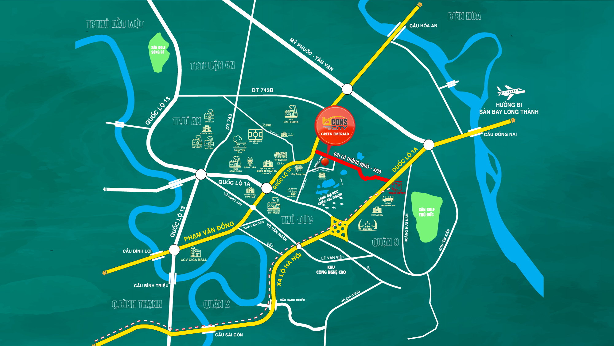 Tọa lạc ngay mặt tiền đường Đại lộ Thống Nhất rộng 32m, thuộc phường Đông Hòa, TP Dĩ An, Bình Dương, <strong>Green Emerald</strong> nằm ở vị trí chiến lược được bao bọc bởi ba tuyến đường trọng điểm: Đại lộ Thống Nhất, Quốc lộ 1K và Xa lộ Hà Nội